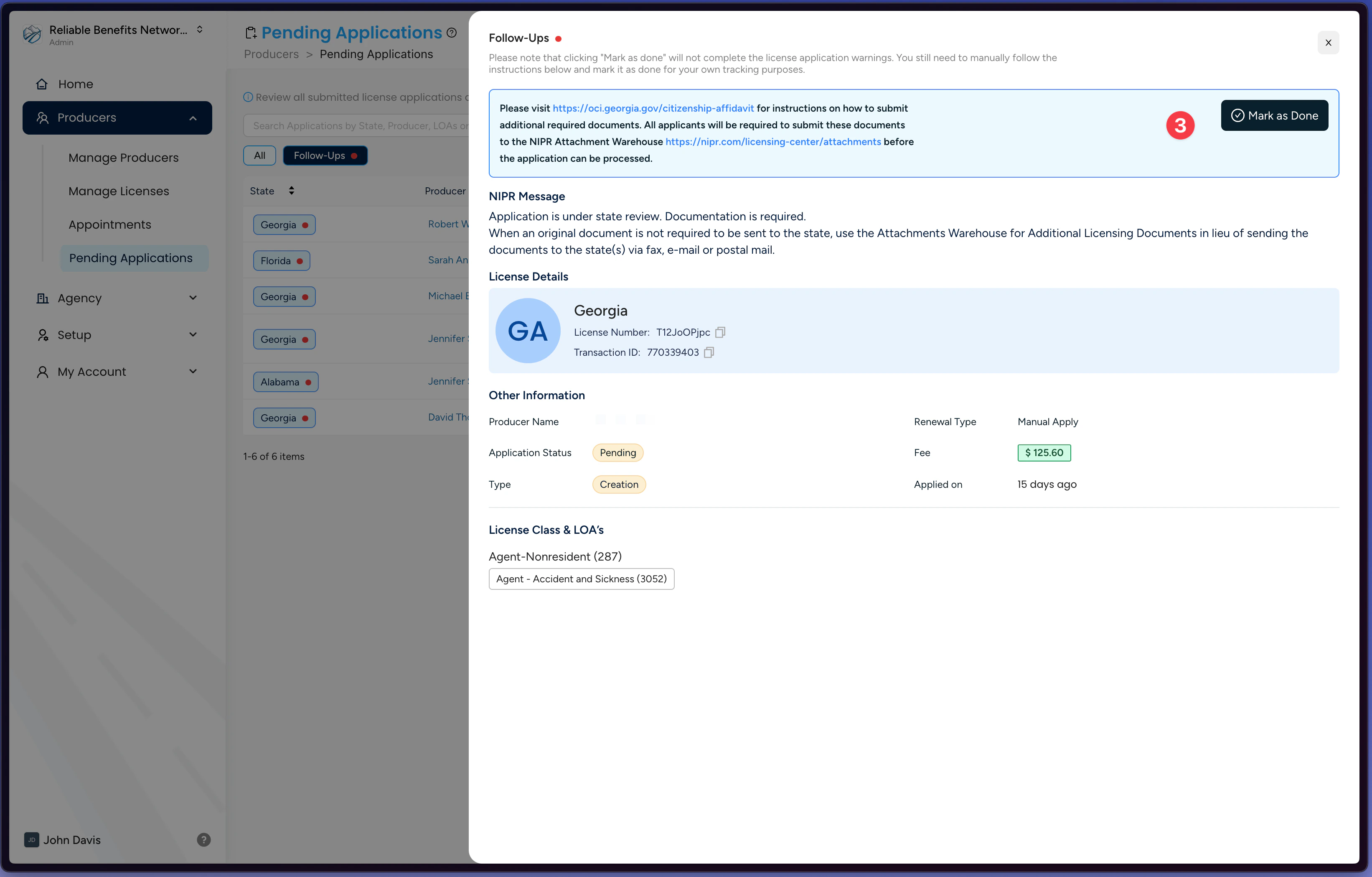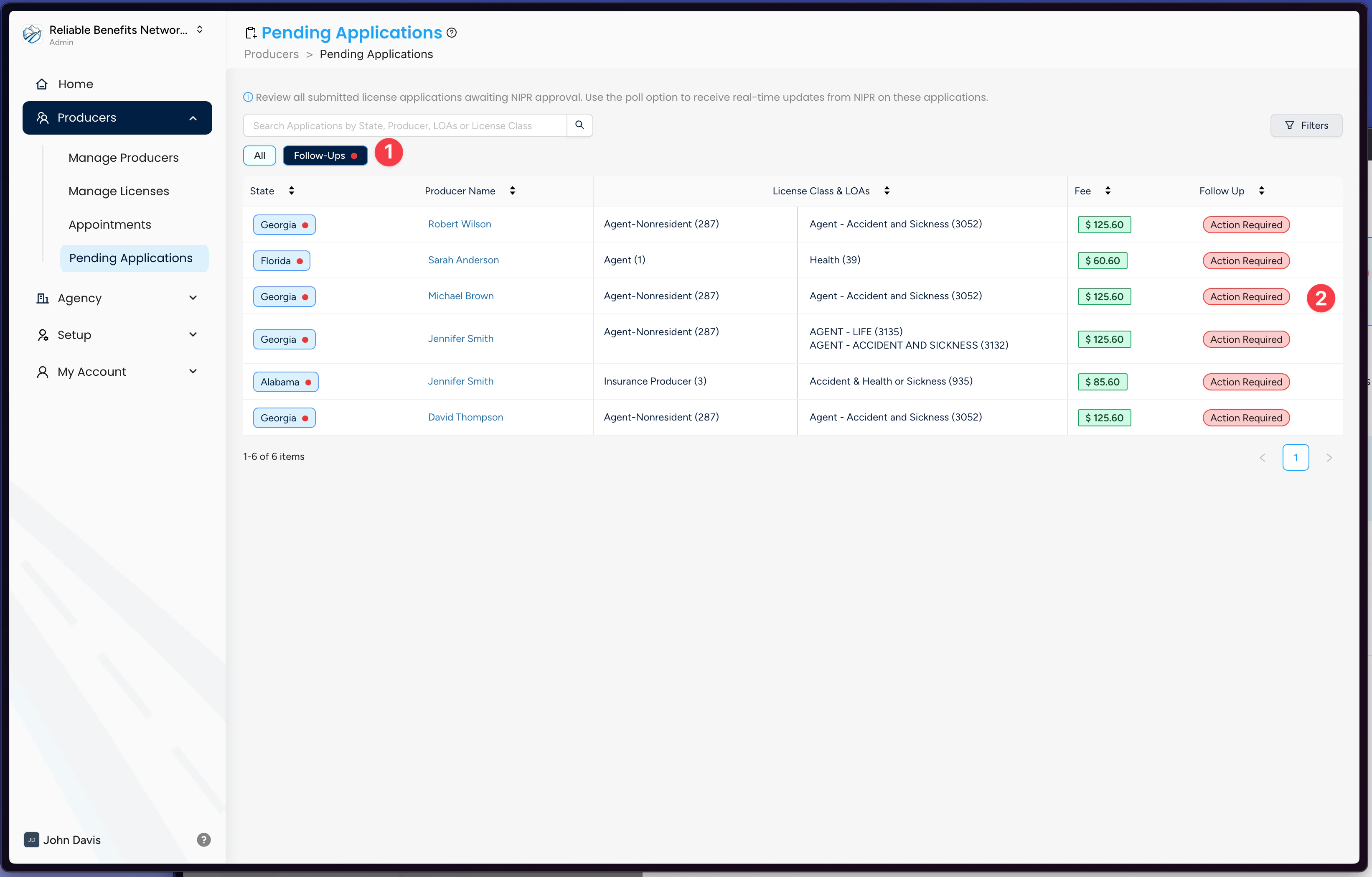 With InsureTrek, we’re helping automate as much as we can about how you apply for a license. But in a few states, there are still manual steps that you have to address. So, we’ve introduced Follow Ups.With Follow Ups, you can keep track of the manual steps you need to take on an application. Here’s how to use it:
