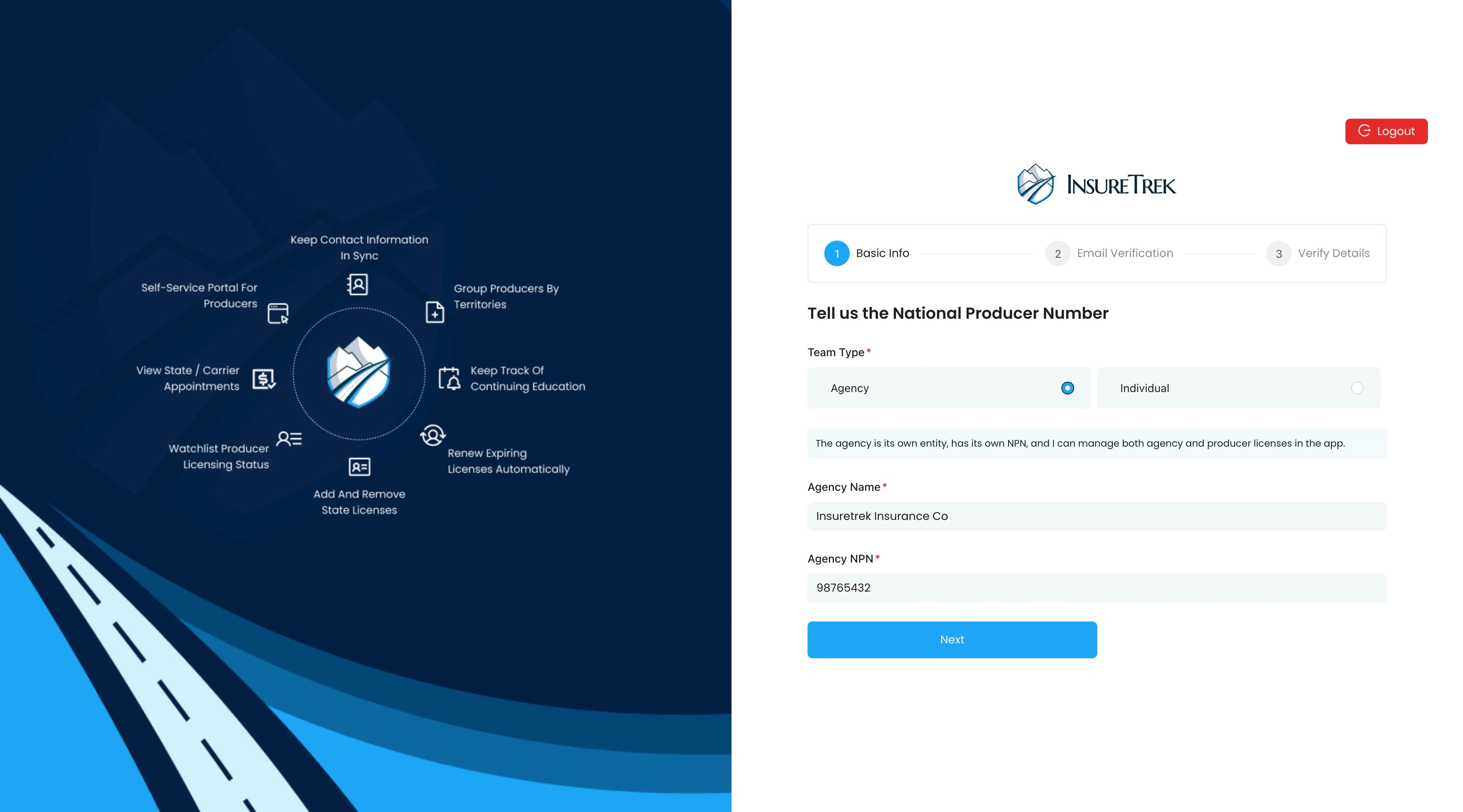 Now in InsureTrek, you can get everything started on your own. No need to wait for us to help pay any startup costs. Getting an account created is simple:- Head to the signup page and enter your information.